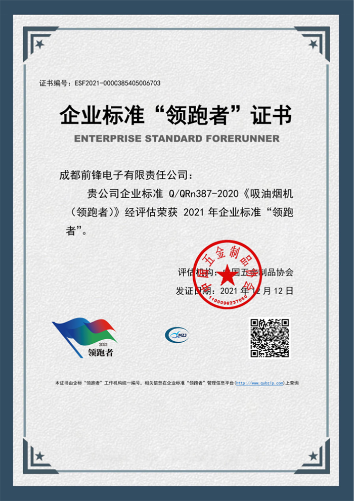 近日,由中國標準化研究院主辦的《2021年全國企業標準“領跑者”榜單》發布。成都前鋒電子有限責任公司生產的前鋒牌吸油煙機CXW-200-L803在評比中脫穎而出,憑借先進的技術和優秀的產品質量,榮獲企業標準《吸油煙機(領跑者)》殊榮,成為成都地區行業唯一一家獲得殊榮的企業!